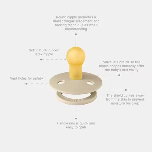 Meet the iconic pacifier that BIBS was built on - a timeless favorite bringing comfort and joy to babies for over 45 years. The air releasing valve allows air to escape and condense during sucking, enabling the nipple to naturally conform to your baby’s palate, mimicking a real nipple. The curved anti-irritation shield reduces skin contact, minimizing moisture buildup and preventing irritation around the mouth. Made from natural rubber latex, the nipple offers skin-like softness and warmth for a soothing experience. Its high elasticity and durability allow for realistic movement and resilience against strong suction. Free from BPA, PFAS, and phthalates, the dummy ensures safety. Three ventilation holes provide optimal airflow, enhancing comfort and security. Available in various colors and prints, it combines style with function. Offered in three growth-friendly sizes, it supports healthy oral development. Designed and manufactured in Denmark/EU with precision and quality.