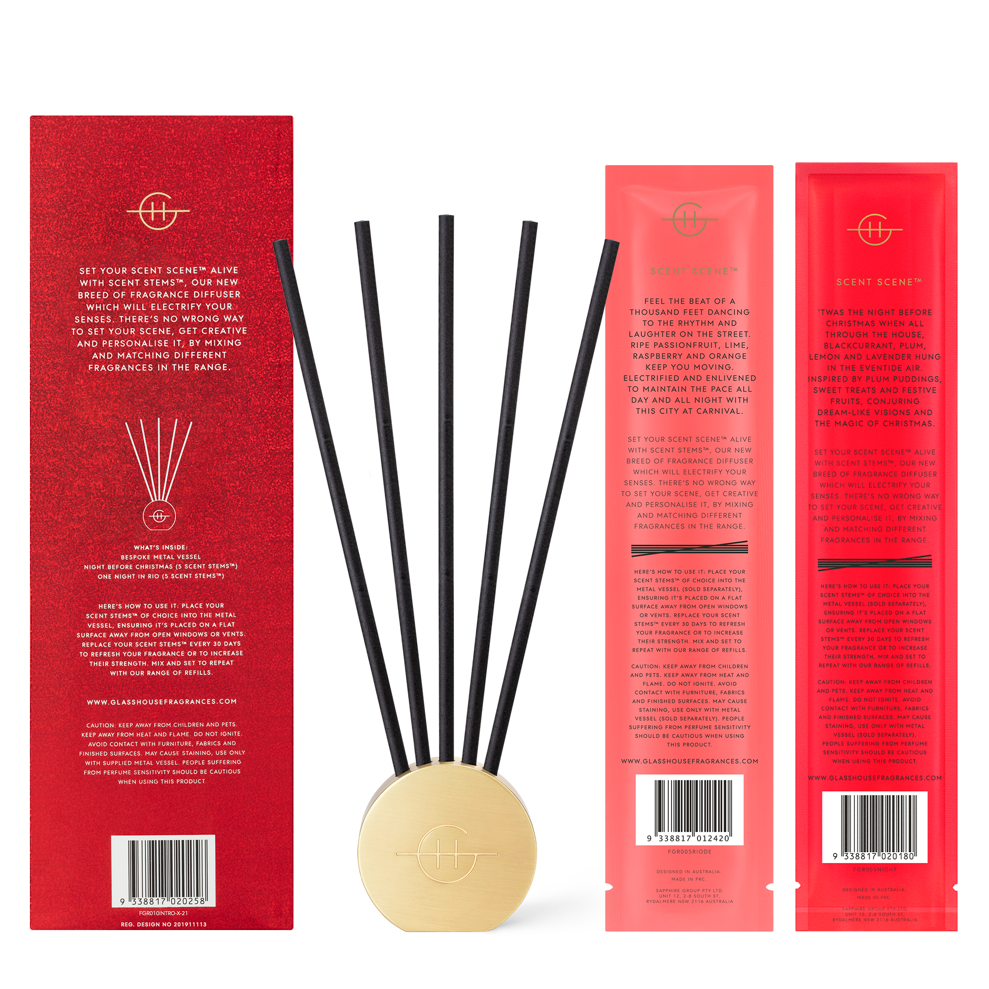 Contains brushed metal vessel and 2 x refills: fun and fruity One Night in Rio, and our cult-favourite holiday scent Night Before Christmas.