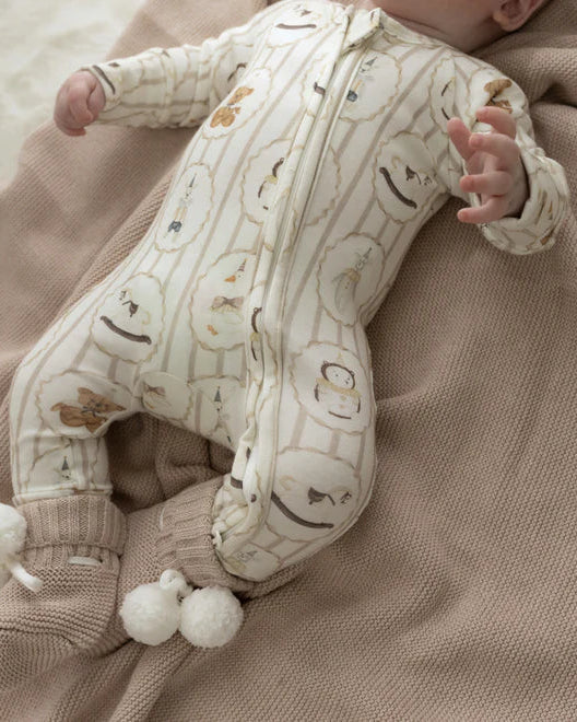 This season’s feature print in our neutral range, Vintage Treasures showcases nostalgic keepsakes in gentle sand and oat tones, finished with a premium YKK double-ended zip for smooth changes—perfect for gifting and pairing with our knit blankets.