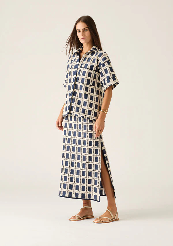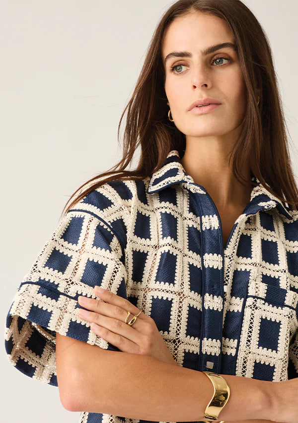Relaxed in its shaping, this short sleeve shirt entices with a beautiful sense of texture, as it shows off an exclusive crochet tile design in ivory and navy. Fastening at the front with complementary tonal buttons, the shirt completes the look with navy piped detailing at the sharp shirt collar, dropped shoulders, broad cuffs and single patch pocket at the chest.