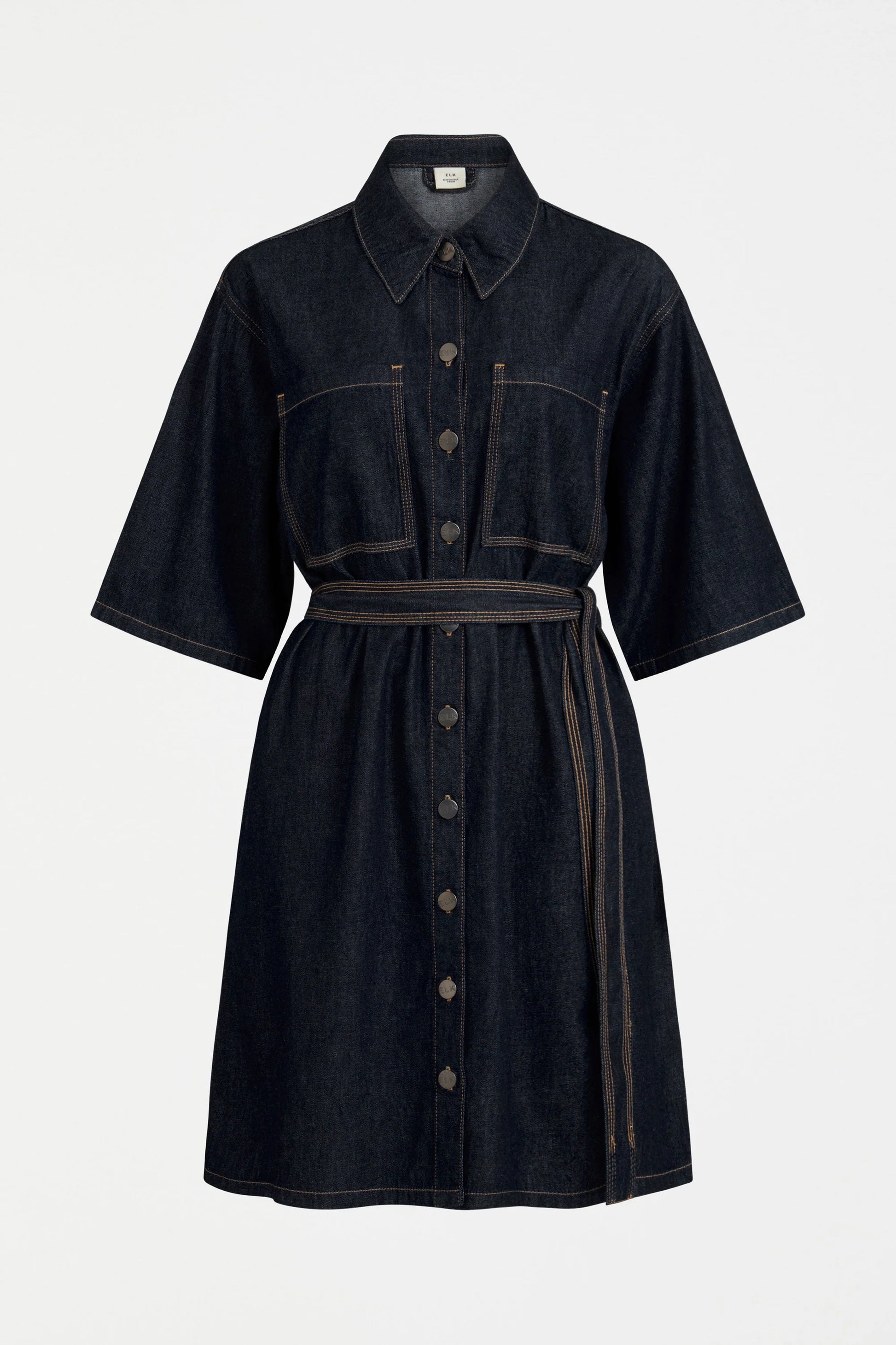 The Denym Pocket Dress is a relaxed button through dress, crafted from lightweight 100% cotton denim. Making a statement with contrast rust coloured stitching, back yoke detailing and metal buttons. Finished with bold front pockets, and a matching contrast stitched denim sash. ELK's reimagining of a modern classic.