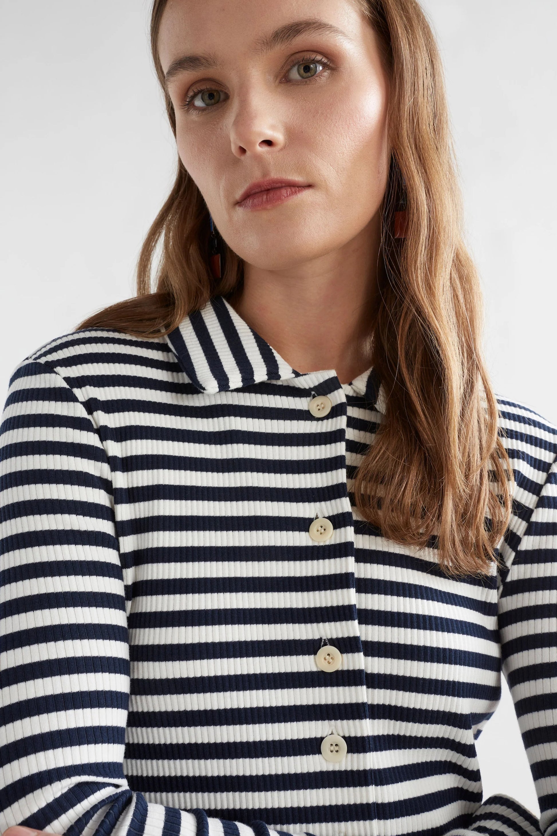Classic stripes get a modern makeover with the Kullan Striped Shirt. Crafted from premium organic cotton blended with elastane, it offers a comfortable stretch that moves with you. The neat silhouette features a traditional collar and button-through front. The Kullan Striped Shirt is equally at home tucked into high-waisted trousers or paired comfortably with weekend denim like the Myes Jean for a more relaxed look.