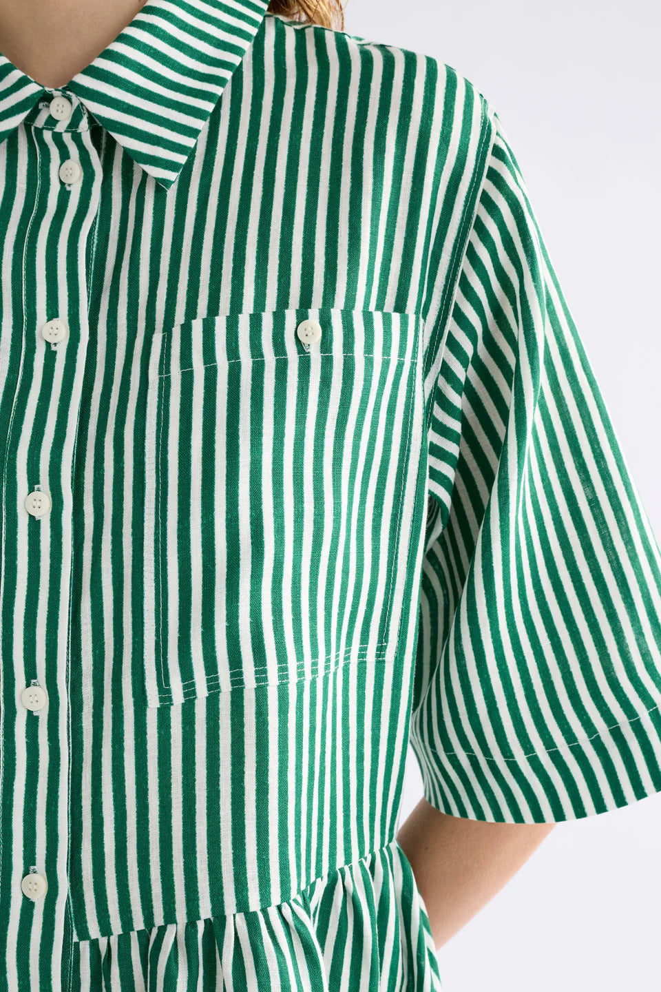 A fresh take on a warm-weather staple, this maxi shirt dress is crafted from 100% French linen in the Ortler Print, a rich green print punctuated by crisp white stripes. It features a classic shirt collar and button-through placket, with a regular fit through the bust that falls into a full, softly gathered skirt. Finished with chest patch pockets and side-seam pockets, it’s an easy piece to wear your way. Slip it on with simple sandals for everyday outings, or pair it with a heel when you want to lift the look.