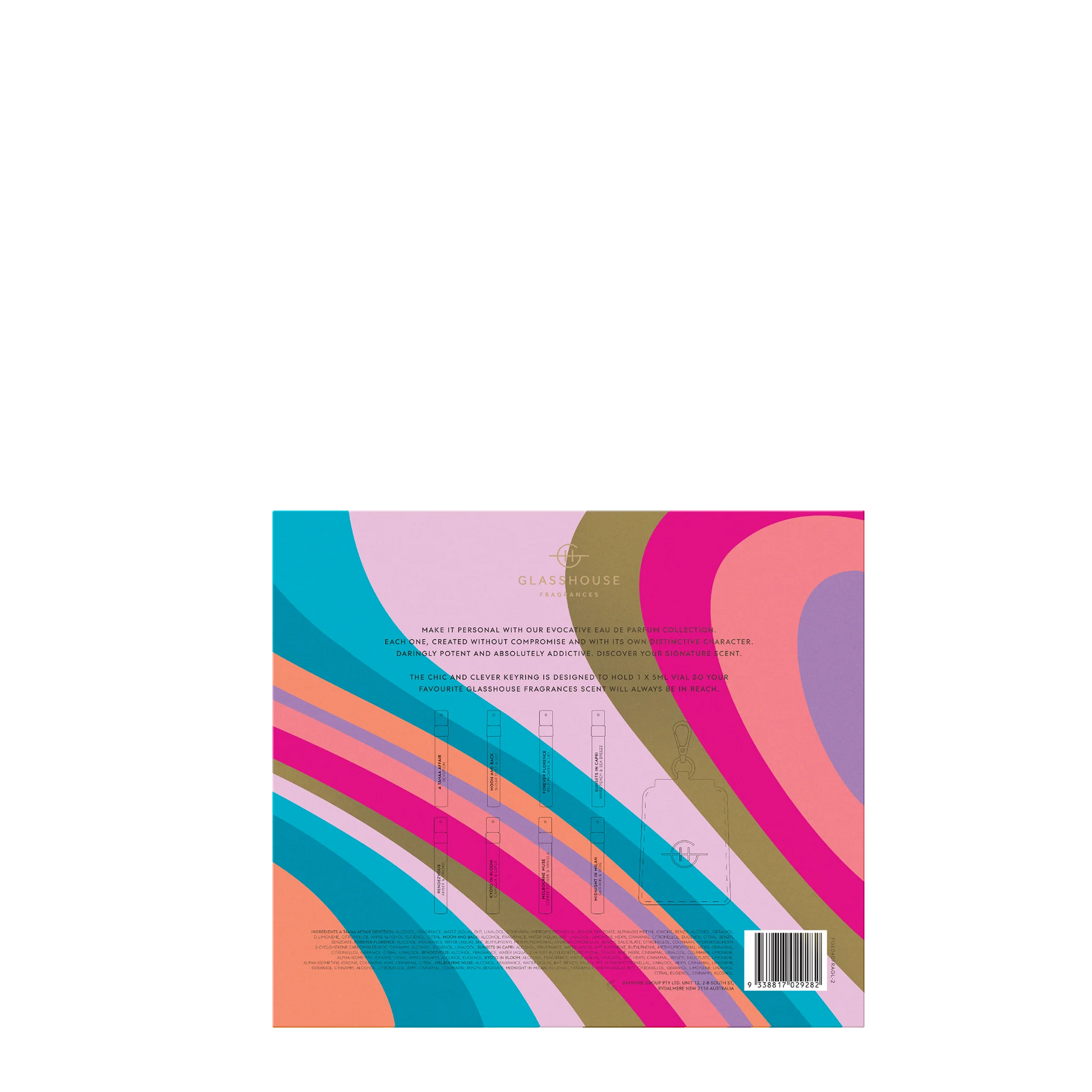 Contains 8 x 5ml Eau de Parfums and branded pouch keyring for 1 x 5ml vial.