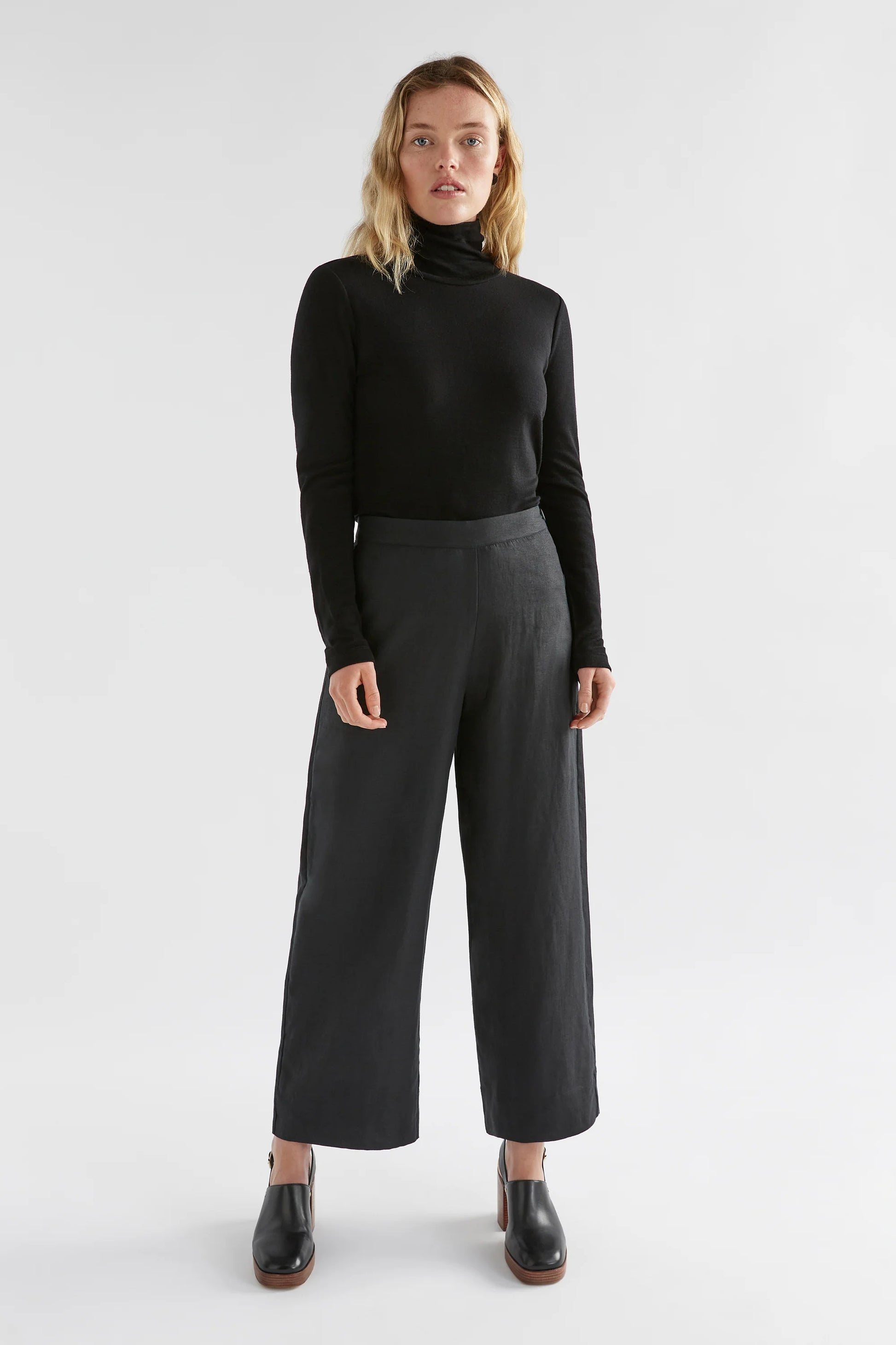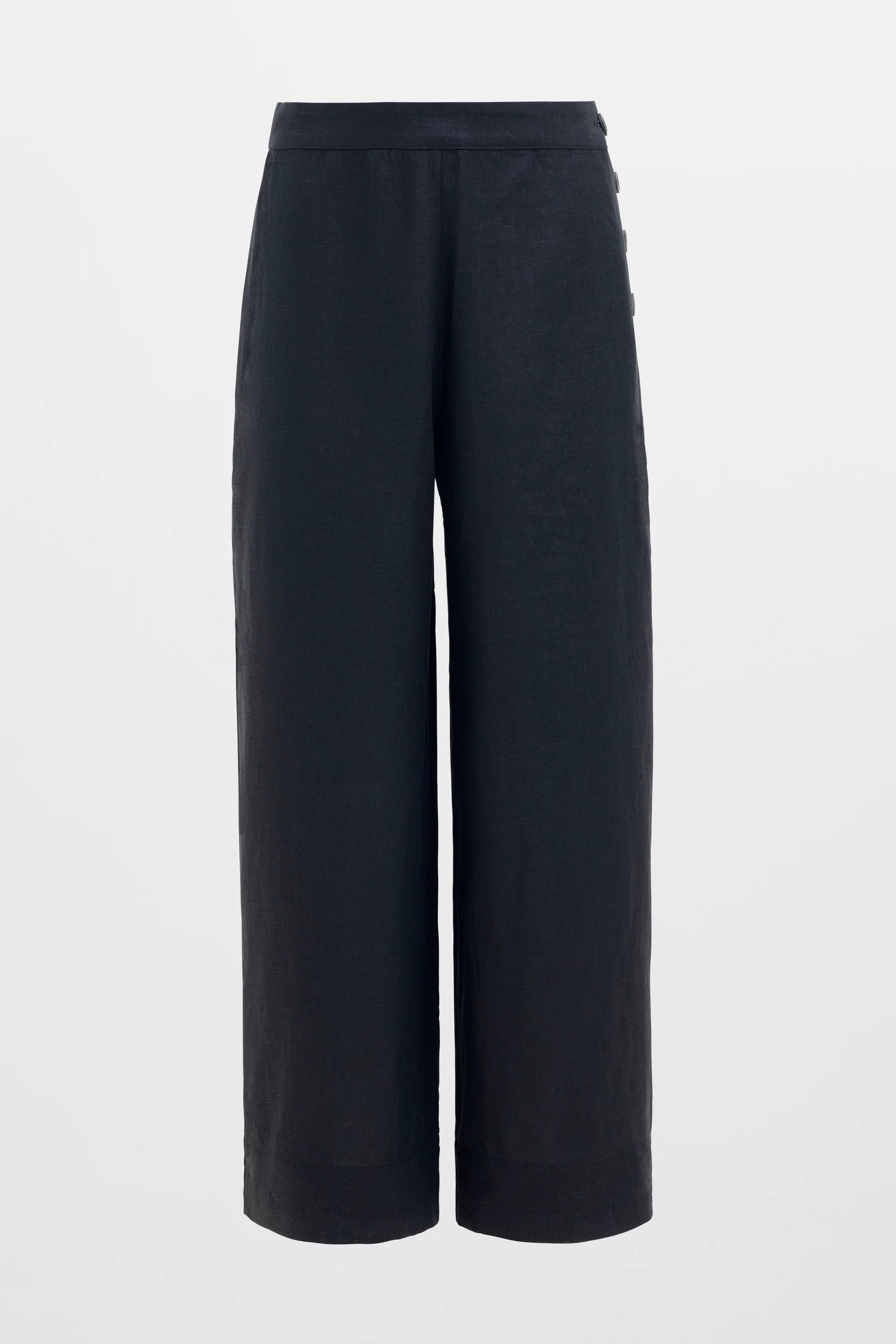 Our Hersom Pant is a high waisted, straight legged design crafted from 100% French linen. This lightweight piece has been designed with a left side button and tab closure detailing, faux back welt pockets and a wide cuff that allows for versatile styling. Roll at the cuff and pair with sneakers for a relaxed, casual style or dress up with platform sandals for a contemporary look.