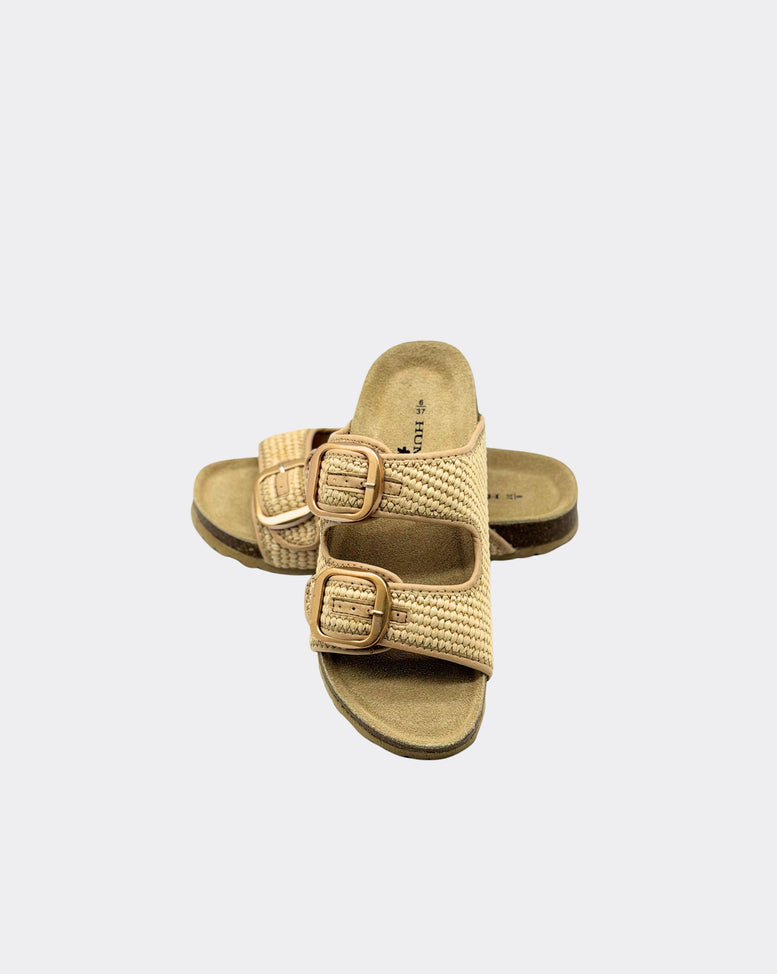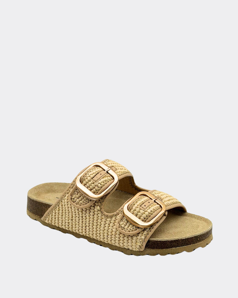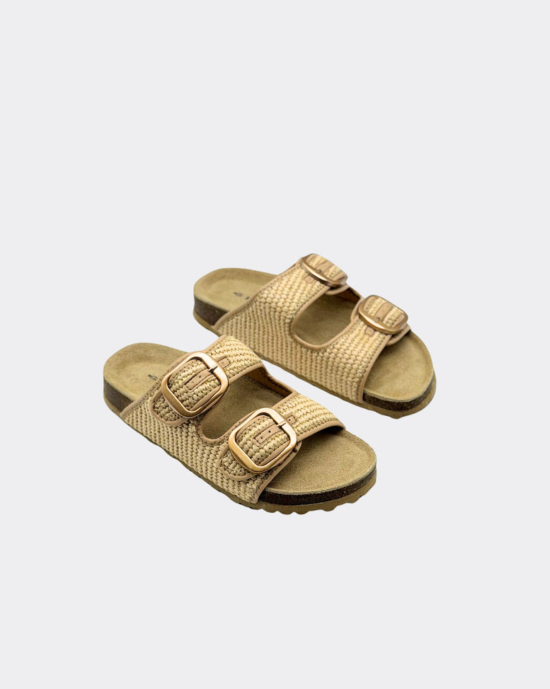 On-trend Raffia upper with adjustable double-buckle closures on a moulded footbed. • Raffia upper • leather innersole • Adjustable Metal buckle feature • Designed in Australia