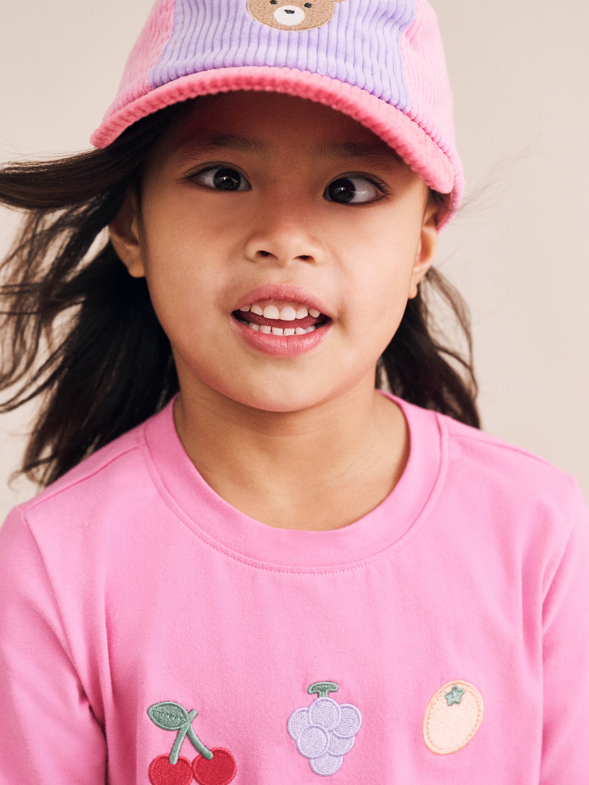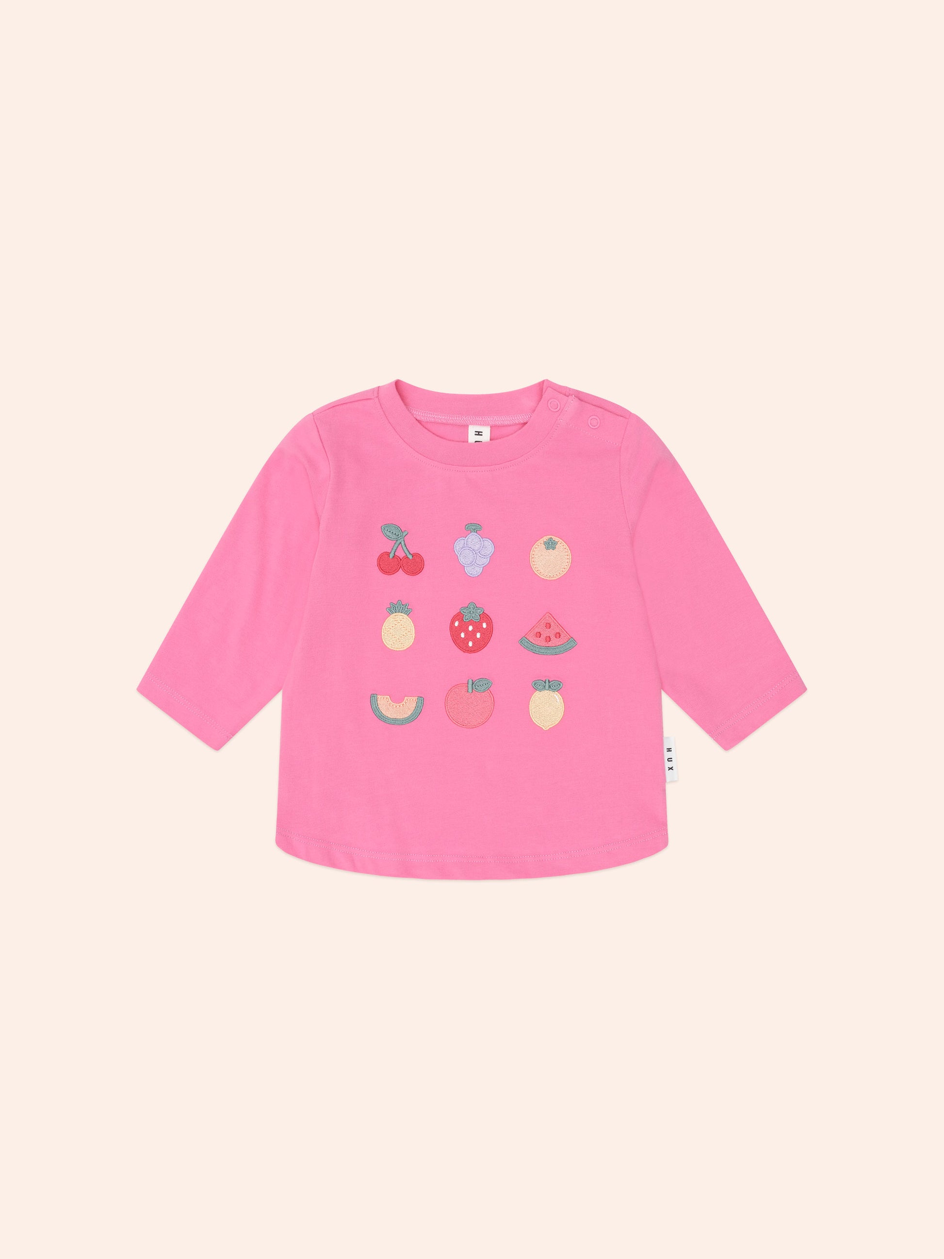 The perfect everyday top, but with a sweet fruity twist. This long sleeve t-shirt is made from buttery-soft organic cotton and features a fruit salad embroidery on the tummy. Baby sizes feature stainless steel shoulder snaps for quick changes.