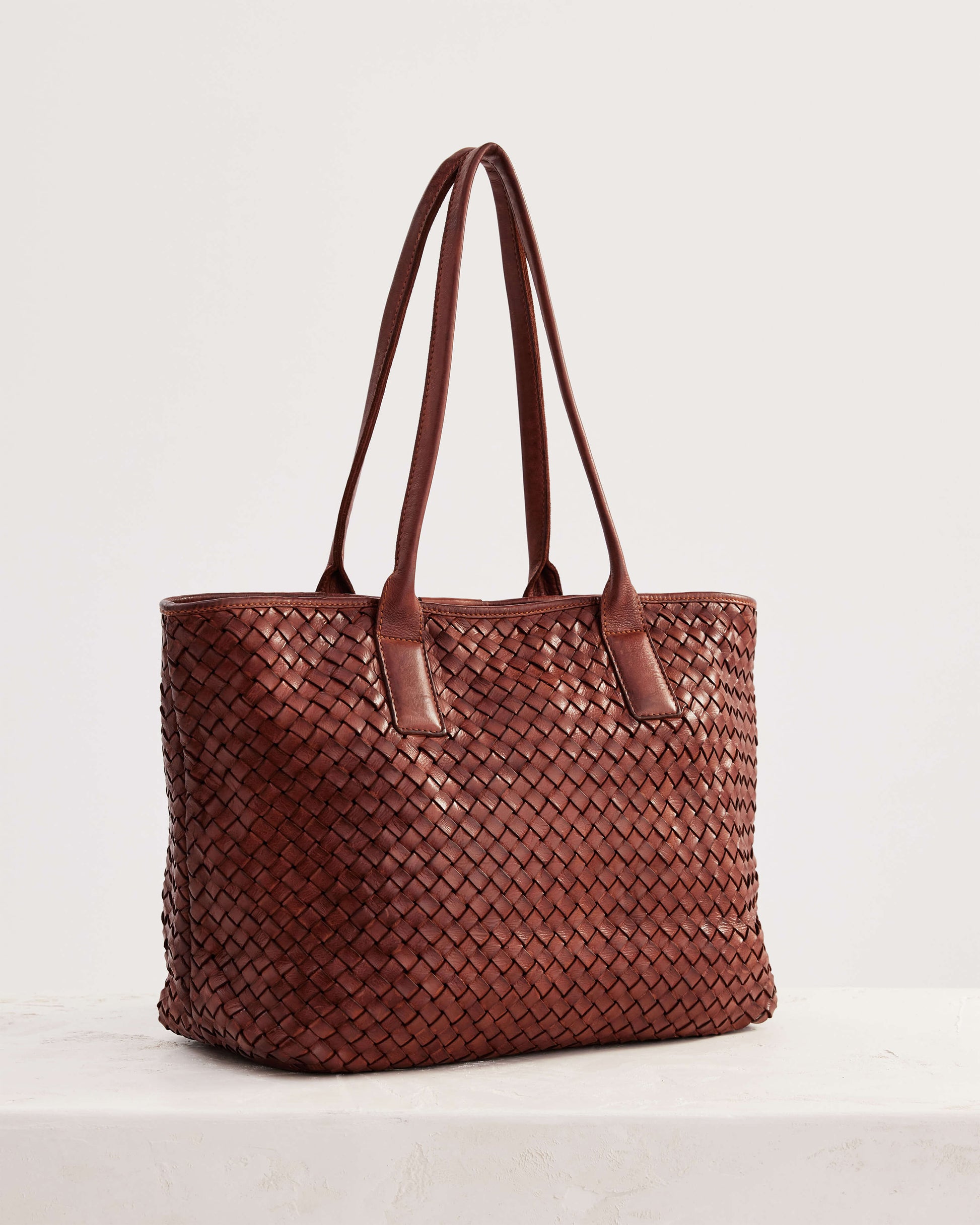 The Basque Tote in Amber is a large tote bag made from light brown woven leather. This tote is the ultimate work bag, with ample space for a laptop, and a top zip closure to keep your things secure.