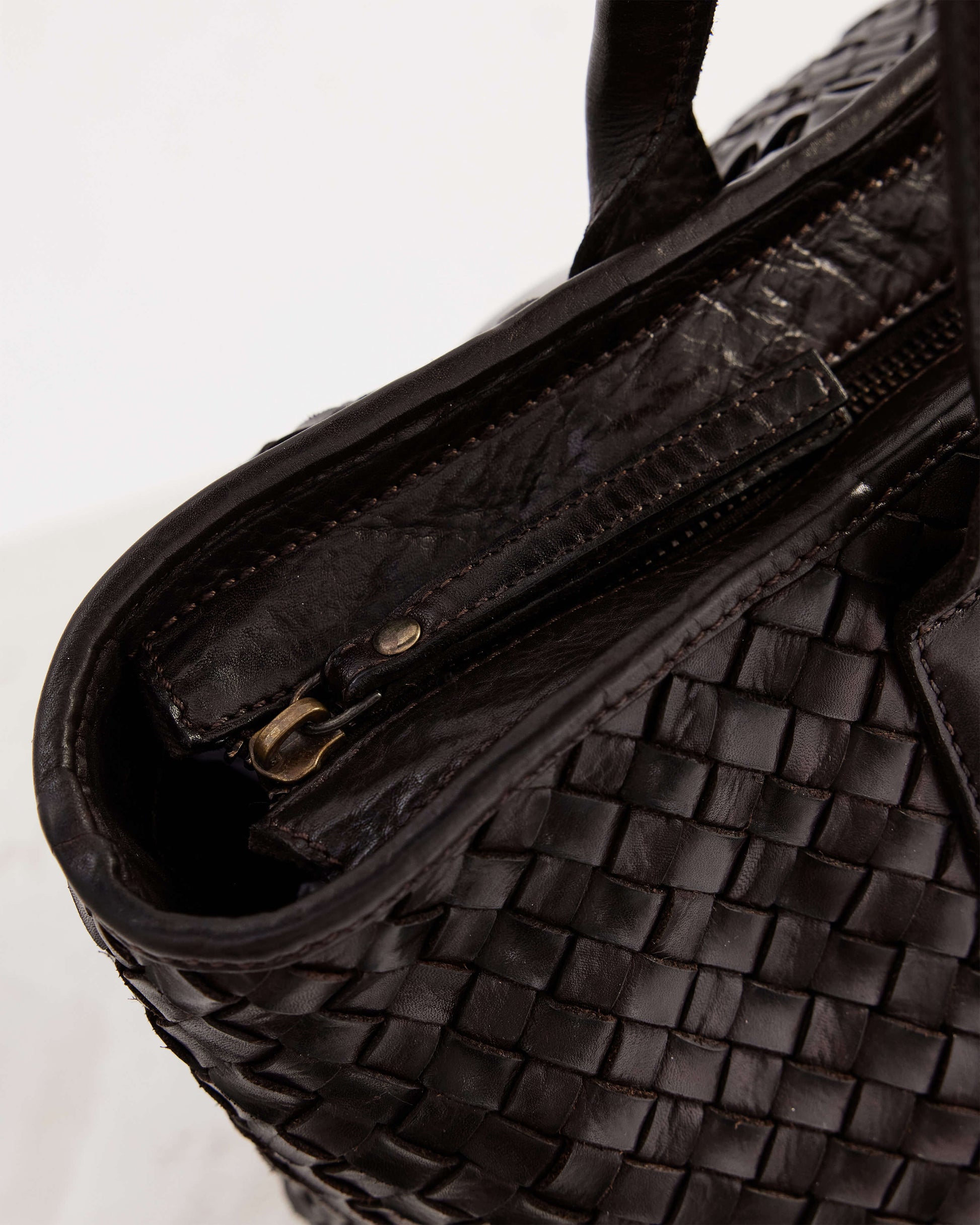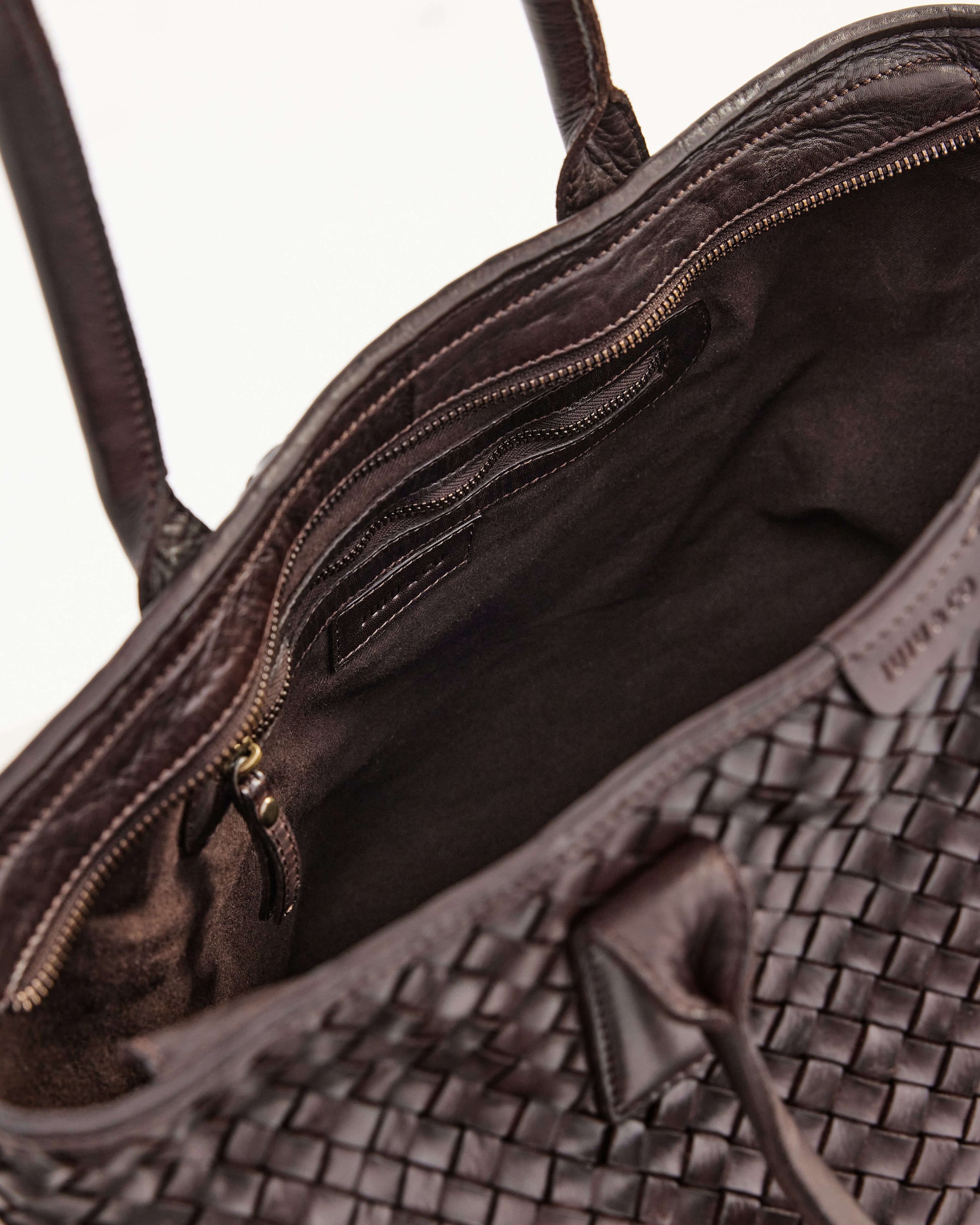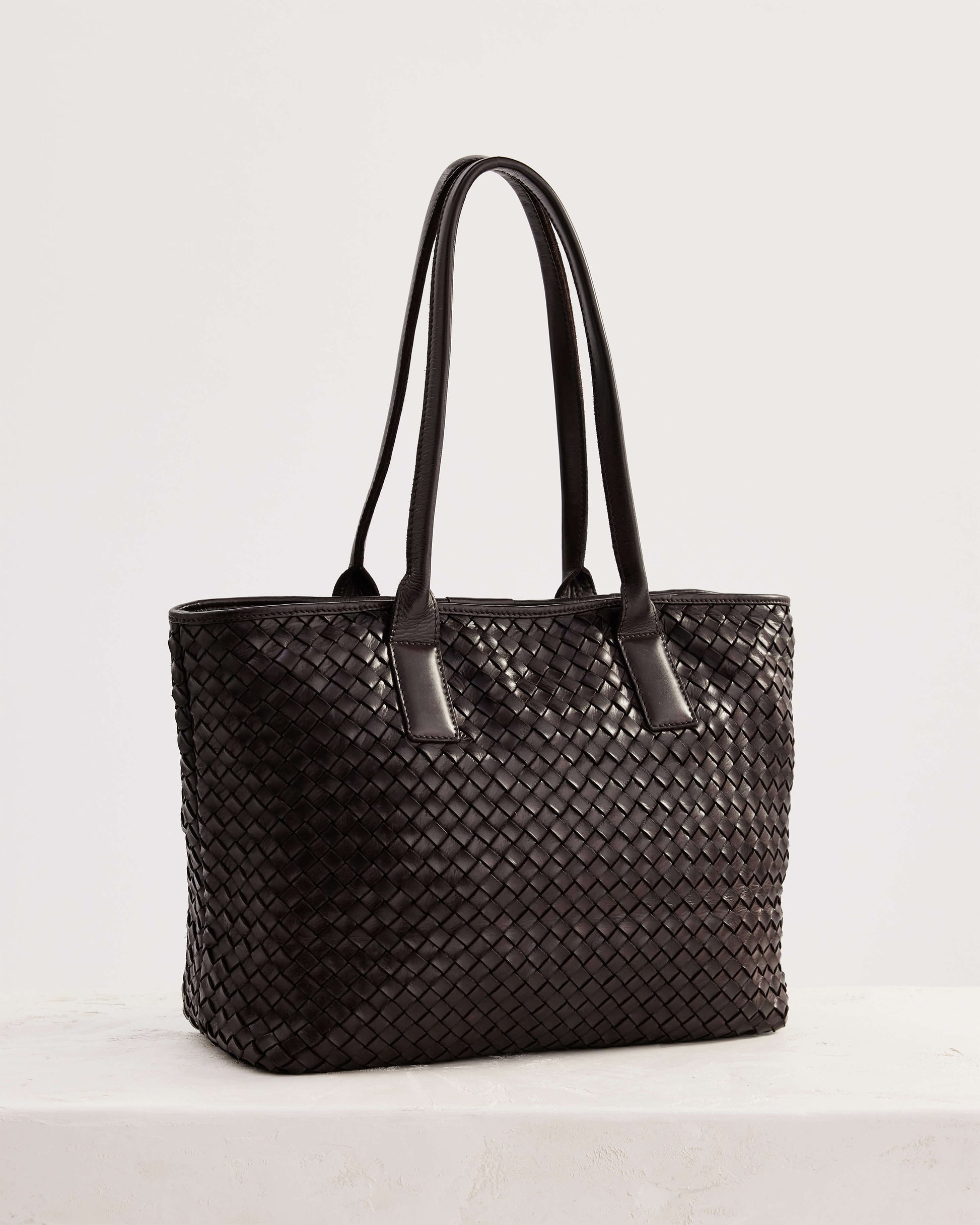 The Basque Tote in Amber is a large tote bag made from light brown woven leather. This tote is the ultimate work bag, with ample space for a laptop, and a top zip closure to keep your things secure.