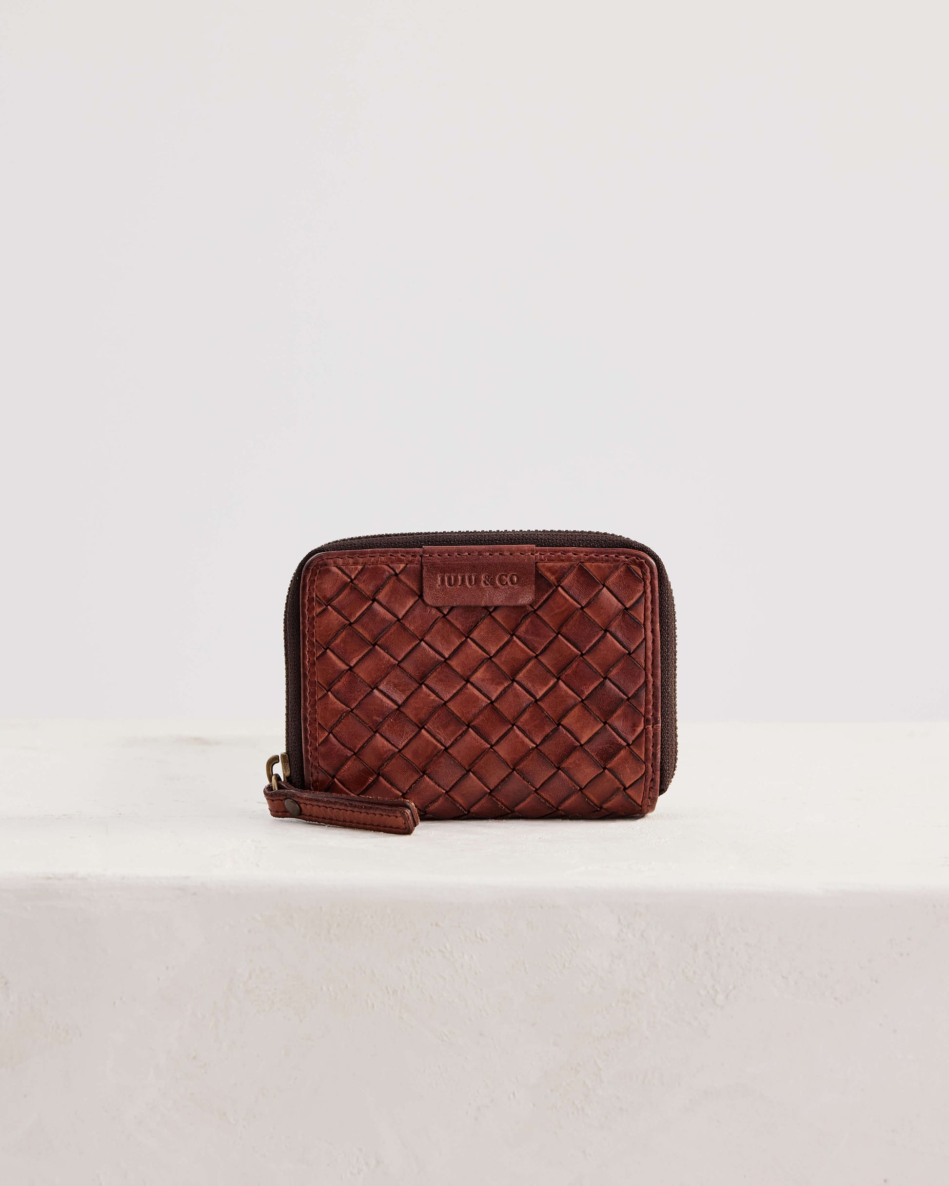 The Small Basque Wallet in Amber is a small zip wallet made from woven leather. Organise in style, with an all leather interior and a zip for security.