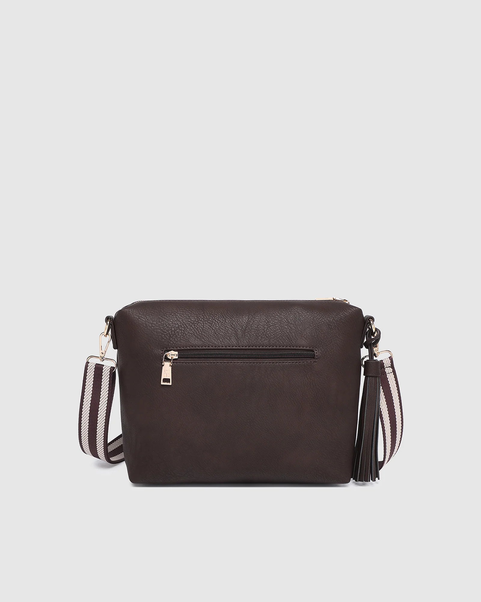The Daisy Chocolate Stripe Crossbody Bag is a best-selling favourite, loved for her buttery soft, slouchy silhouette and effortless versatility. Designed with both style and function in mind, she features two slip pockets, one internal zip pocket, and a back zip pocket to keep essentials secure and organised. Finished with light gold hardware and a playful tassel, Daisy includes two strap options - a sporty, adjustable webbing strap for a relaxed edge, or a matching vegan leather strap for a polished finish. Whether worn casually or styled with sophistication, Daisy adapts effortlessly to your mood and your moment.