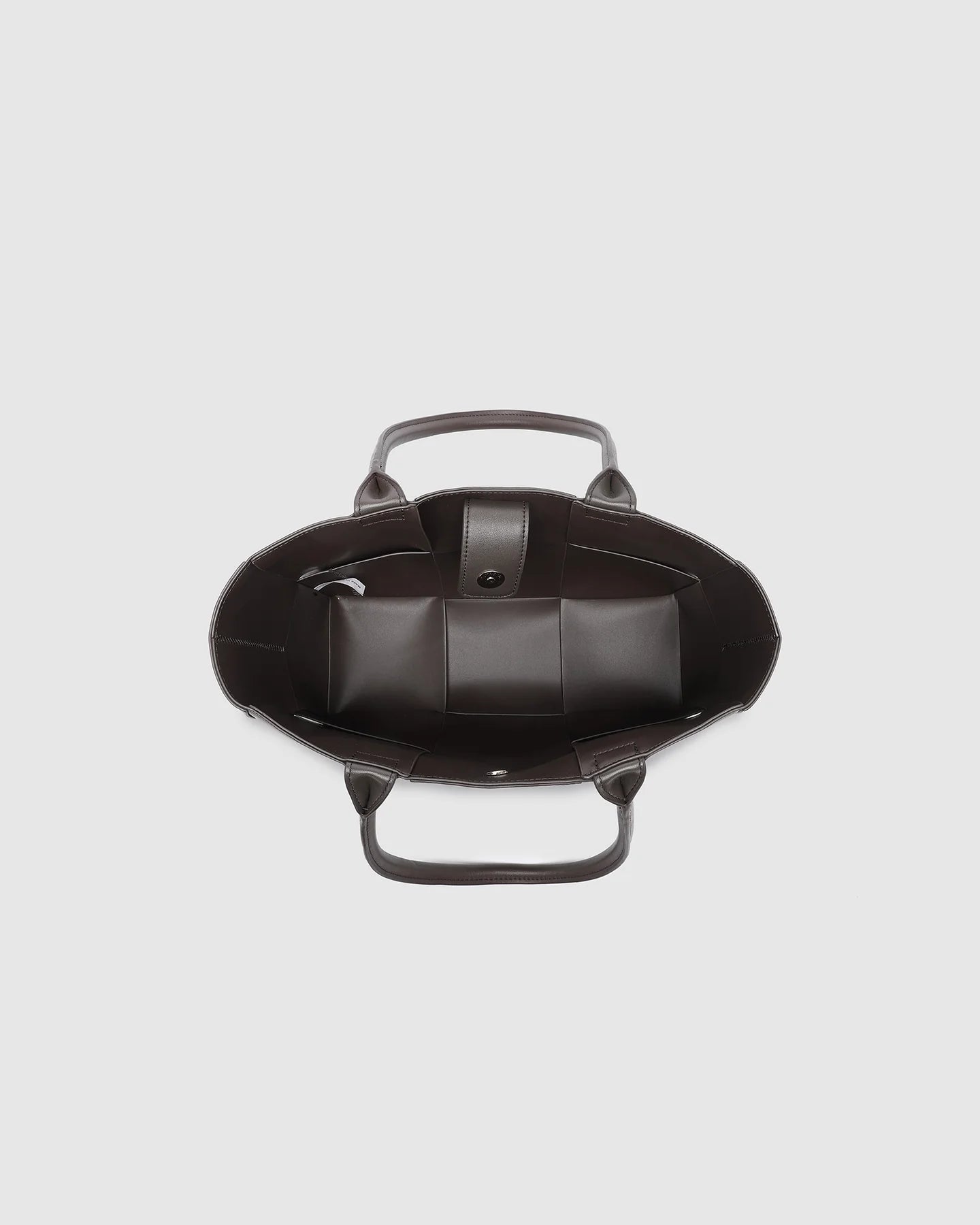 The Gwen Chocolate Handbag brings quiet confidence to your everyday style — structured, textural, and effortlessly composed. Designed in a clean, tailored silhouette, this woven shoulder bag showcases smooth vegan leather and is finished with dual top handles for a refined touch. Compact yet considered, Gwen Chocolate offers just the right amount of space for your daily essentials, secured with a discreet magnetic closure for ease and peace of mind. Her woven detailing softens the structure, creating a thoughtful balance between grounded texture and elevated design. Equally suited to weekday plans and weekend errands, Gwen Chocolate’s timeless silhouette works hard in any wardrobe.