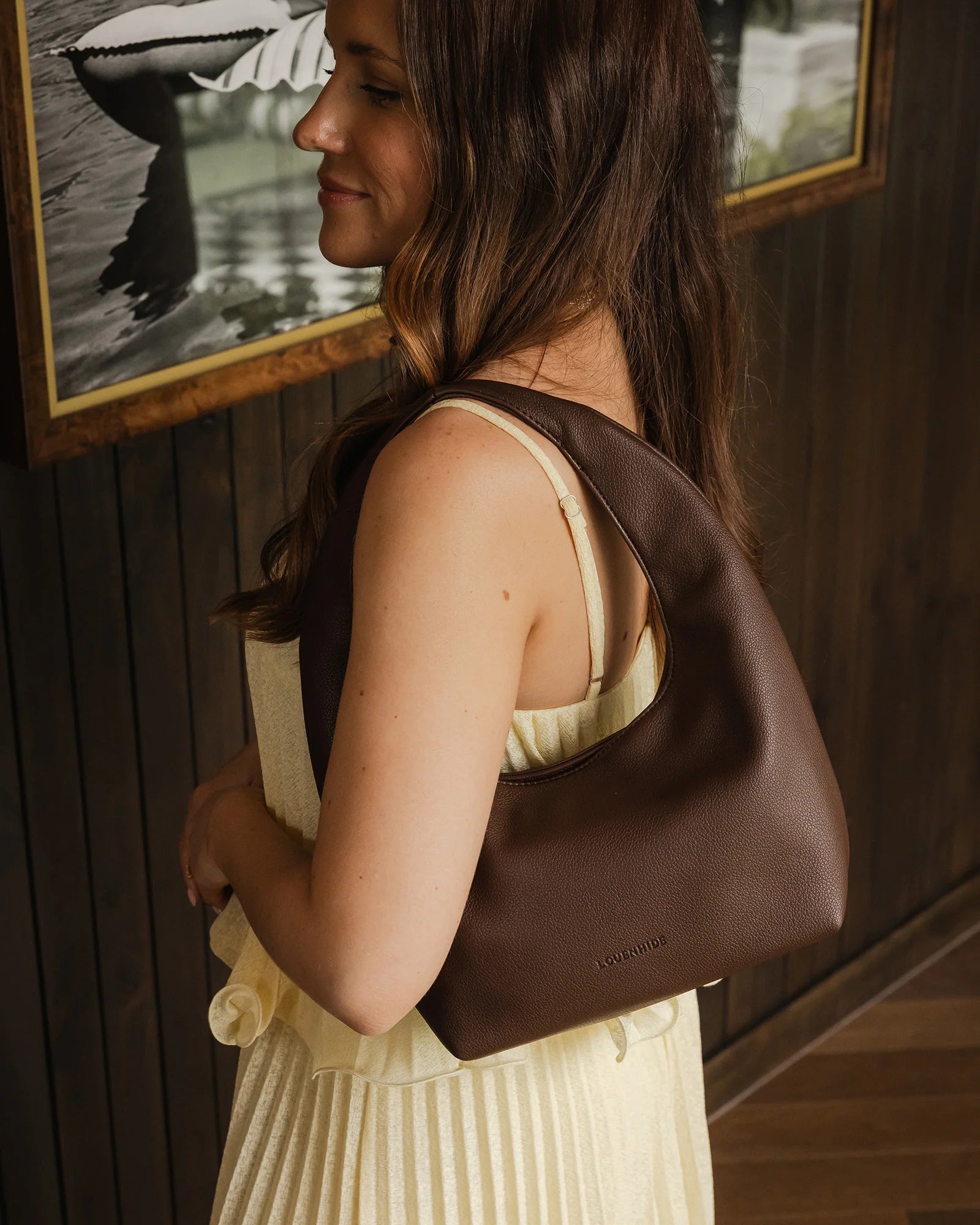 The Mini Monaco Chocolate Shoulder Bag is a playful take on our best-selling Monaco shoulder bag, reimagined in a compact size for sun-soaked days and balmy nights. With the same soft, slouchy shoulder bag silhouette you know and love, Mini Monaco Chocolate is crafted from smooth vegan leather and designed to sit effortlessly under your arm - adding a refined, relaxed finish to any summer look. Light in feel but big on function, this light handbag for summer features a secure zip closure and thoughtfully designed interior that fits your on-the-go essentials with ease. Whether you're wandering coastal towns or meeting friends for golden hour drinks, Mini Monaco Chocolate moves with you - effortlessly transitioning from beachside days to twilight soirées. Simple, elegant, and endlessly wearable, she’s the bag you’ll reach for all summer long.