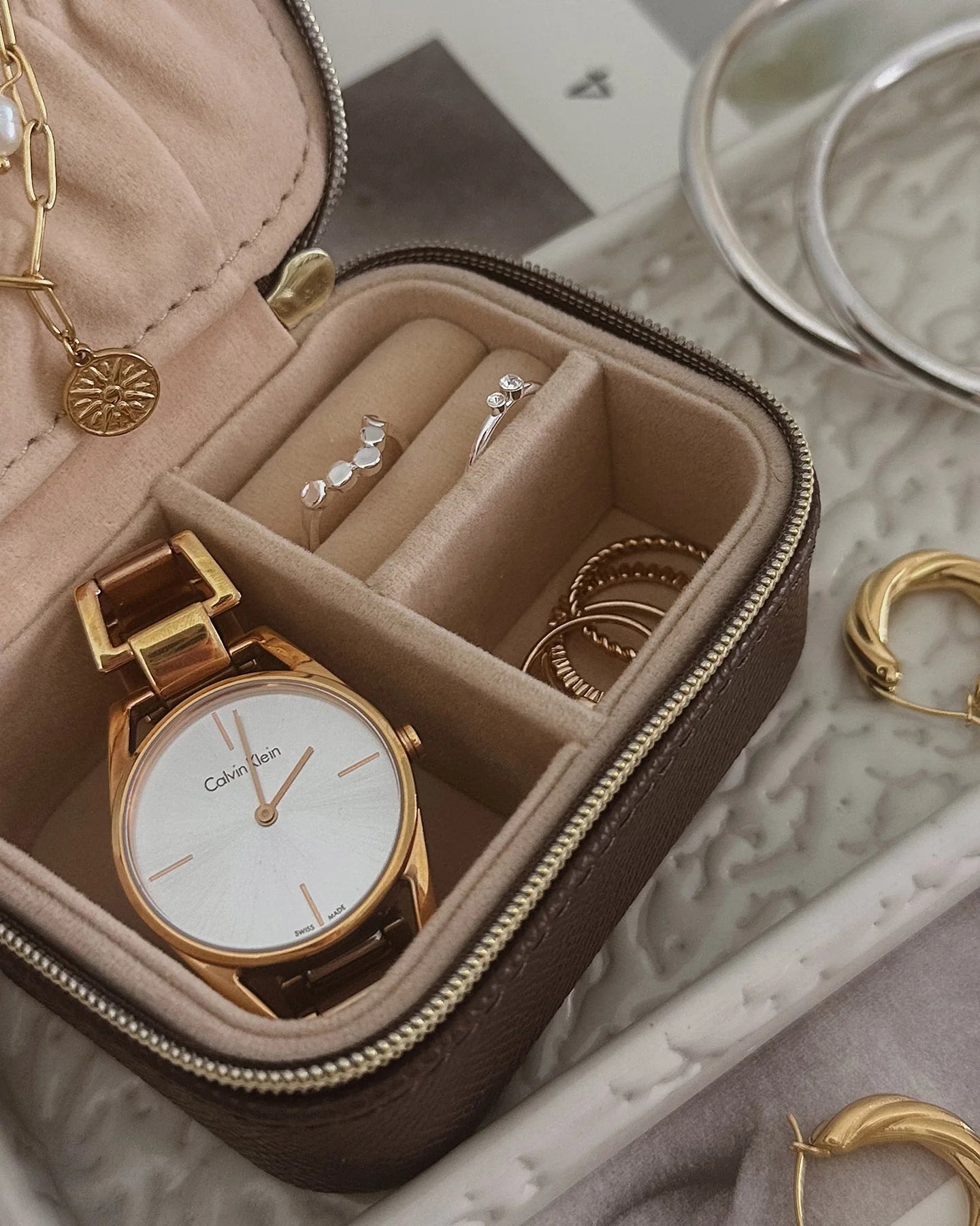 The Louenhide Suzie Jewellery Box is a sweet travel companion ready to store all of your rings, necklaces, bracelets, and earrings. Use every day and stow in your bag for on-the-go use, or pack for weekend adventures. Featuring three ring rolls, two compartments, and an elasticated slip pocket, your precious gems will be secured safely.