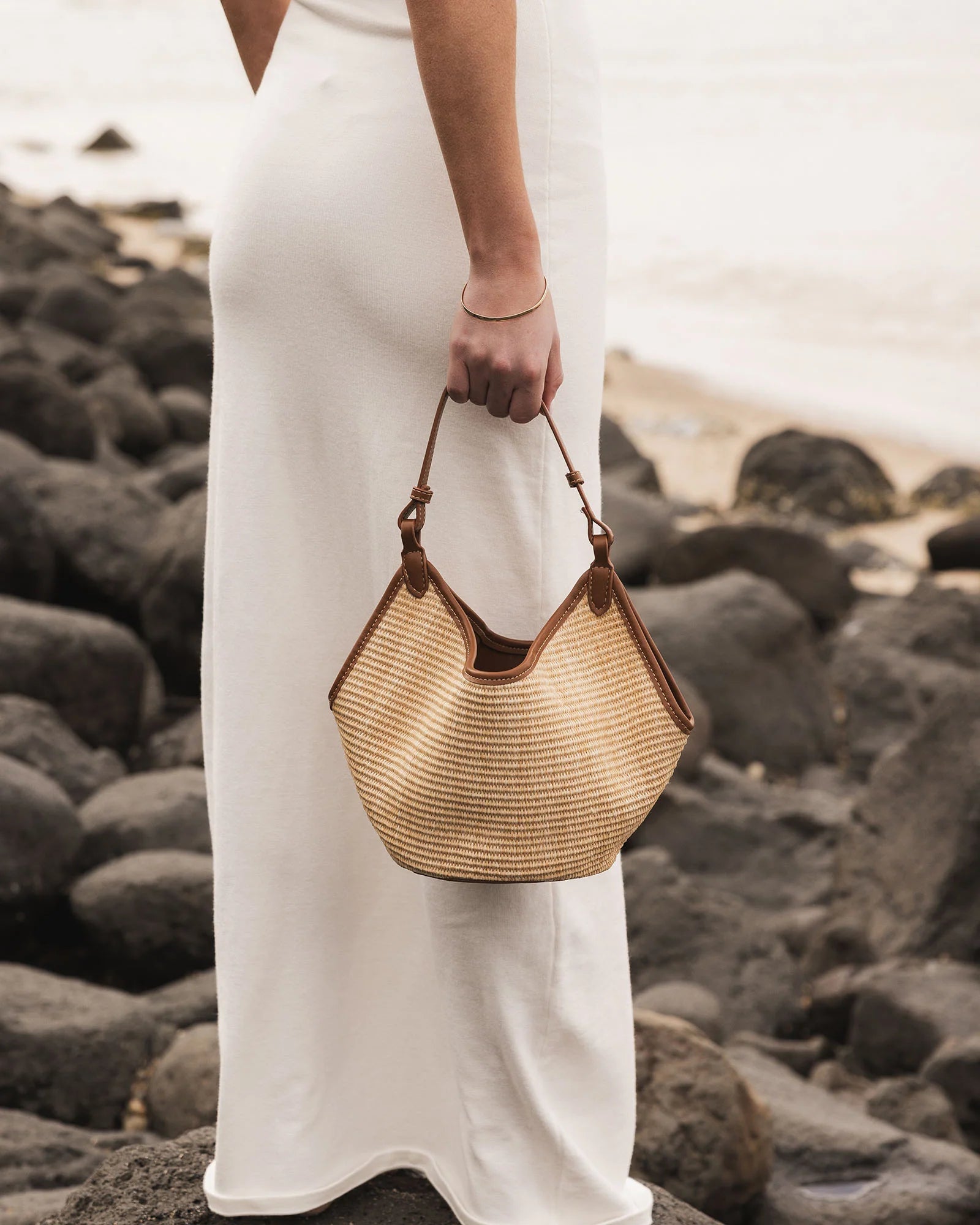 The Taya Raffia Tan Mini Tote Bag is a fresh take on summer styling - petite in size, bold in texture, and made for days under the sun. Crafted from natural raffia and contrasted with buttery soft vegan leather, this top handle bag features a sleek boat-shaped silhouette that brings structure to a relaxed coastal mood. Designed as a versatile convertible tote, Taya Raffia Tan offers multiple ways to wear her: a short vegan leather top handle for a polished look, or an adjustable, detachable crossbody strap for hands-free ease. The balance of the woven body and smooth trim captures the essence of sunlit escapes and beachside strolls, while her compact size makes her the perfect companion for café catch-ups, market mornings, and spritz-soaked afternoons.
