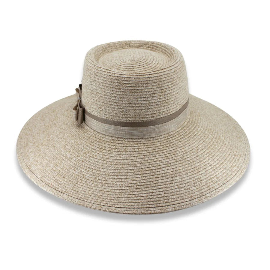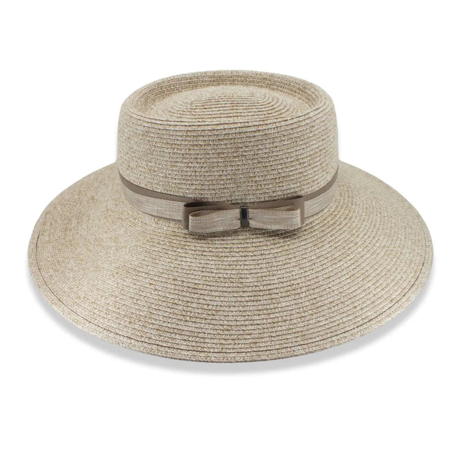 A delicate double ribbon band finishes in a chic side bow, adding a touch of feminine charm to the timeless fedora silhouette. With a generous brim for stylish sun protection and an internal ComfyFit band, the Maia offers a custom, secure fit that keeps you comfortable all day long.