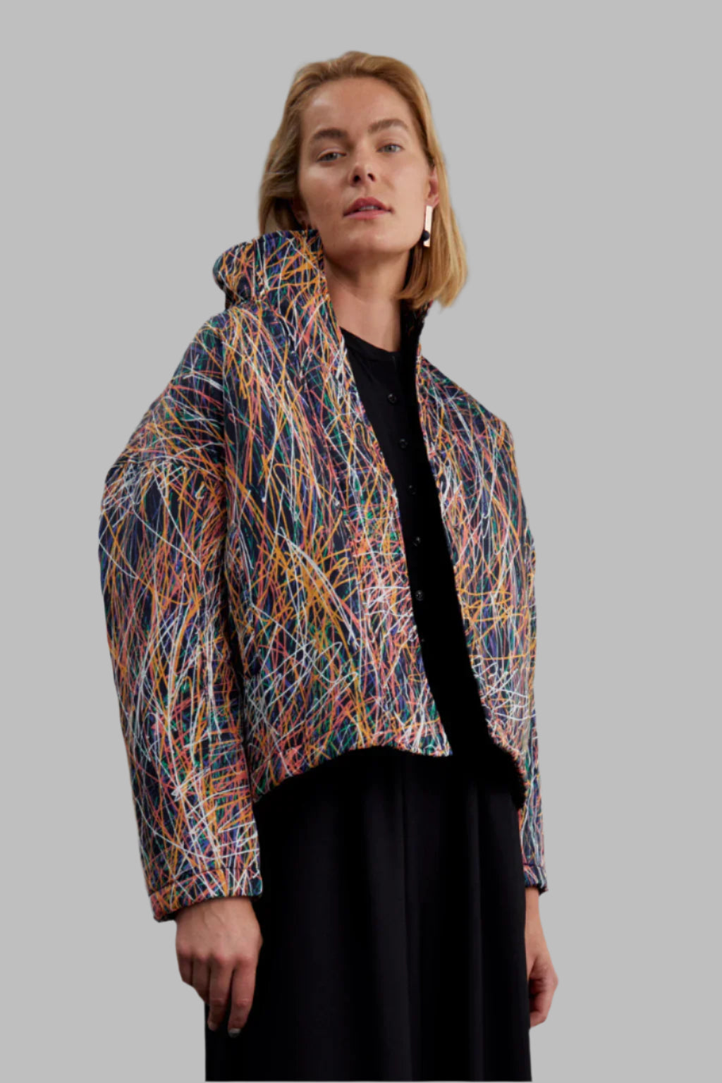 The Maila Puffer is a slight A-line, light wadding jacket with a high collar, a concealed placket with stud closures, and a dropped shoulder. A standard body length, the jacket features panel inserts on the sleeve at the underarm, welt side pockets and a patch pocket inside.