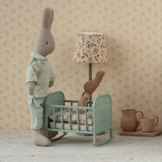 A beautifully designed cradle in metal with a soft sleeping bag and mattress inside. The cradle has a small flower embossment on the headboard and rounded legs so you can rock the little ones to sleep. Measures H9cm x W10cm.