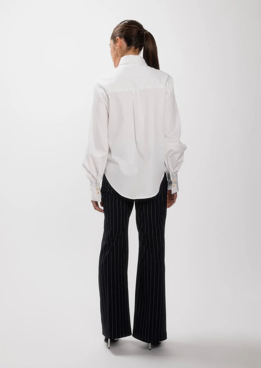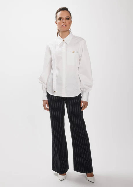 Regular-fit blouse ensembles a hidden button front placket, and crest feature buttons at the neckline, and cuffs. This style also features bishop sleeves with tape detail along the top of the cuff, internal side of the collar and the front shoulder strap. Locally sourced remnant fabrication.