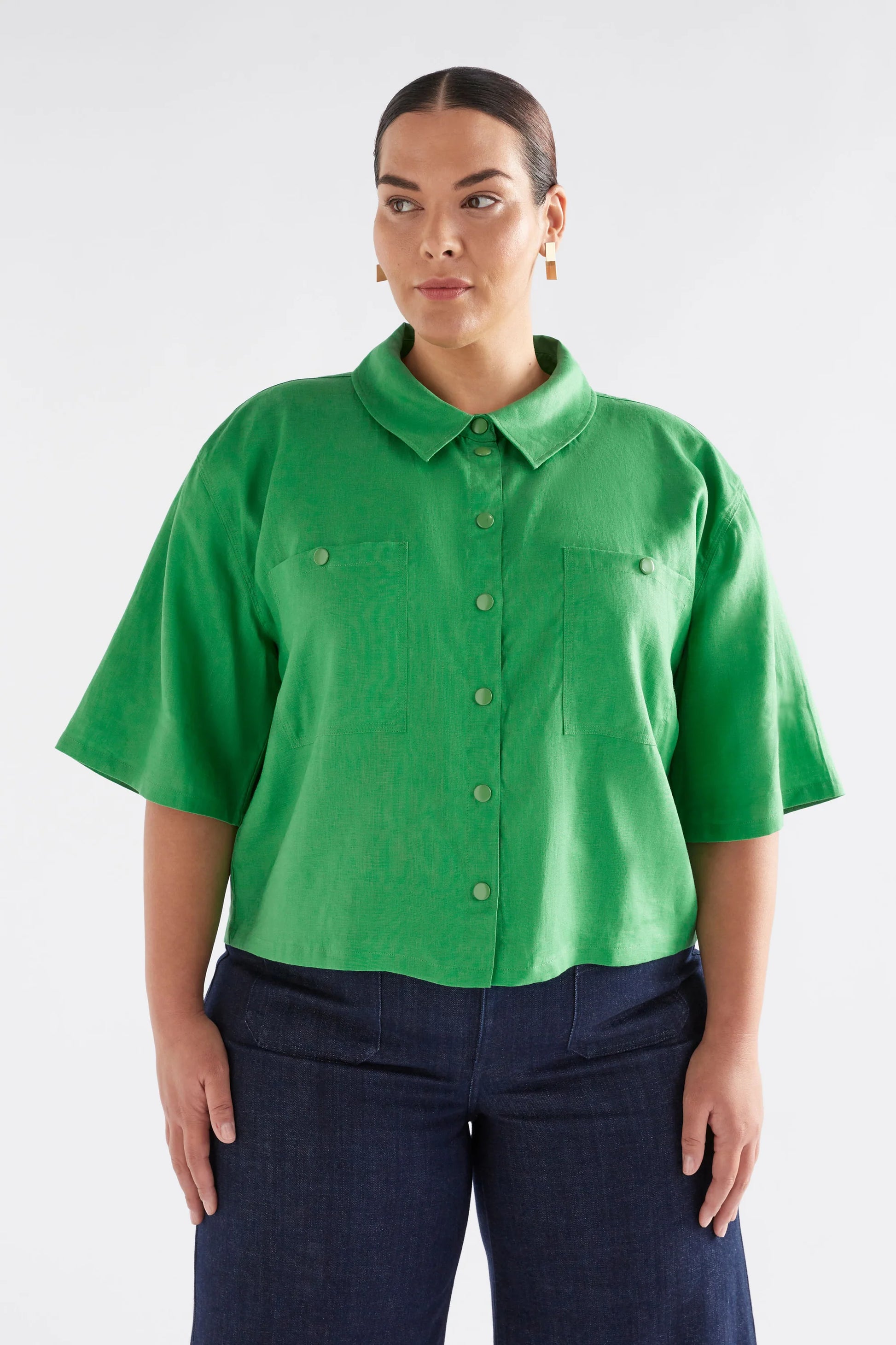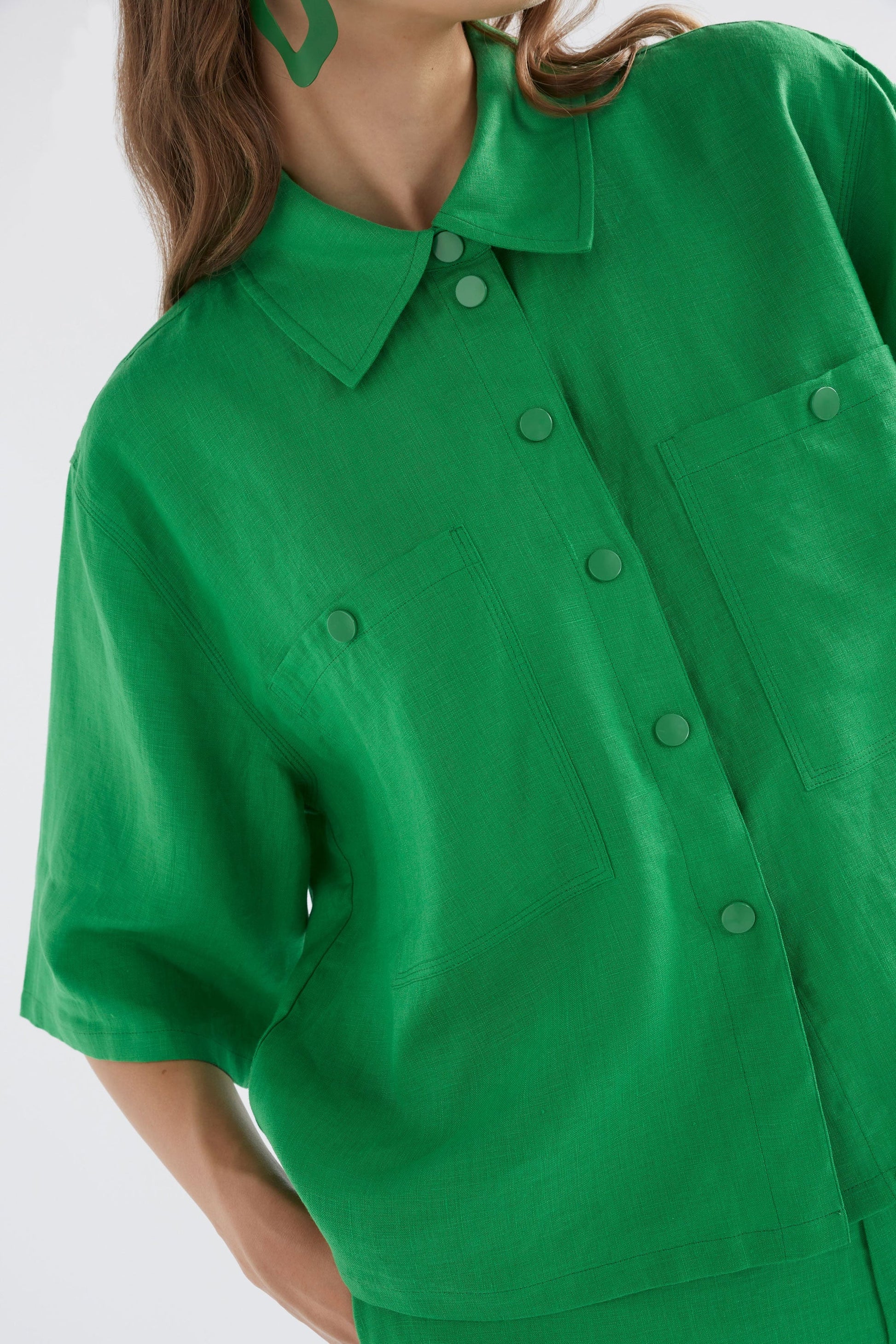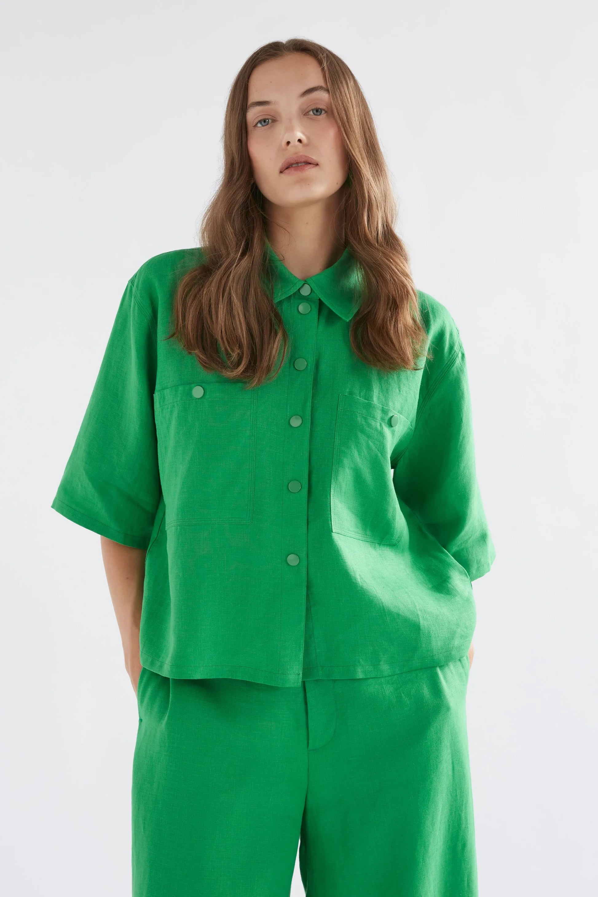 The Nayte Shirt is a button-through style with snap buttons, made from durable French linen. It features a structured statement collar and slightly dropped shoulders, creating a polished yet relaxed look. Bold front patch pockets elevate this classic wardrobe staple. Pair the Nayte Shirt in Vine Green with the Anneli Light Pant for a bold, coordinated look. Available in vibrant seasonal Vine Green and classic Black linen.