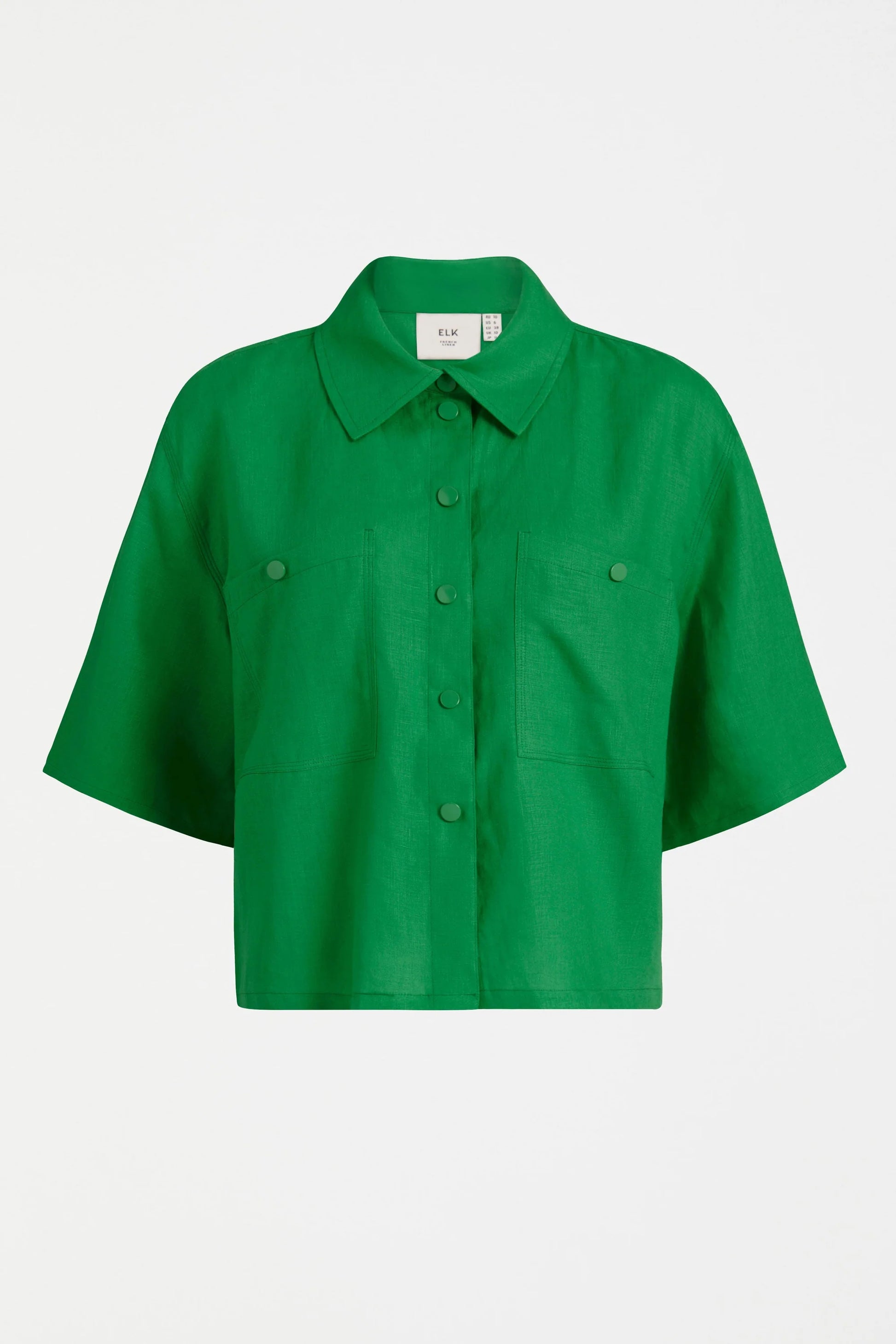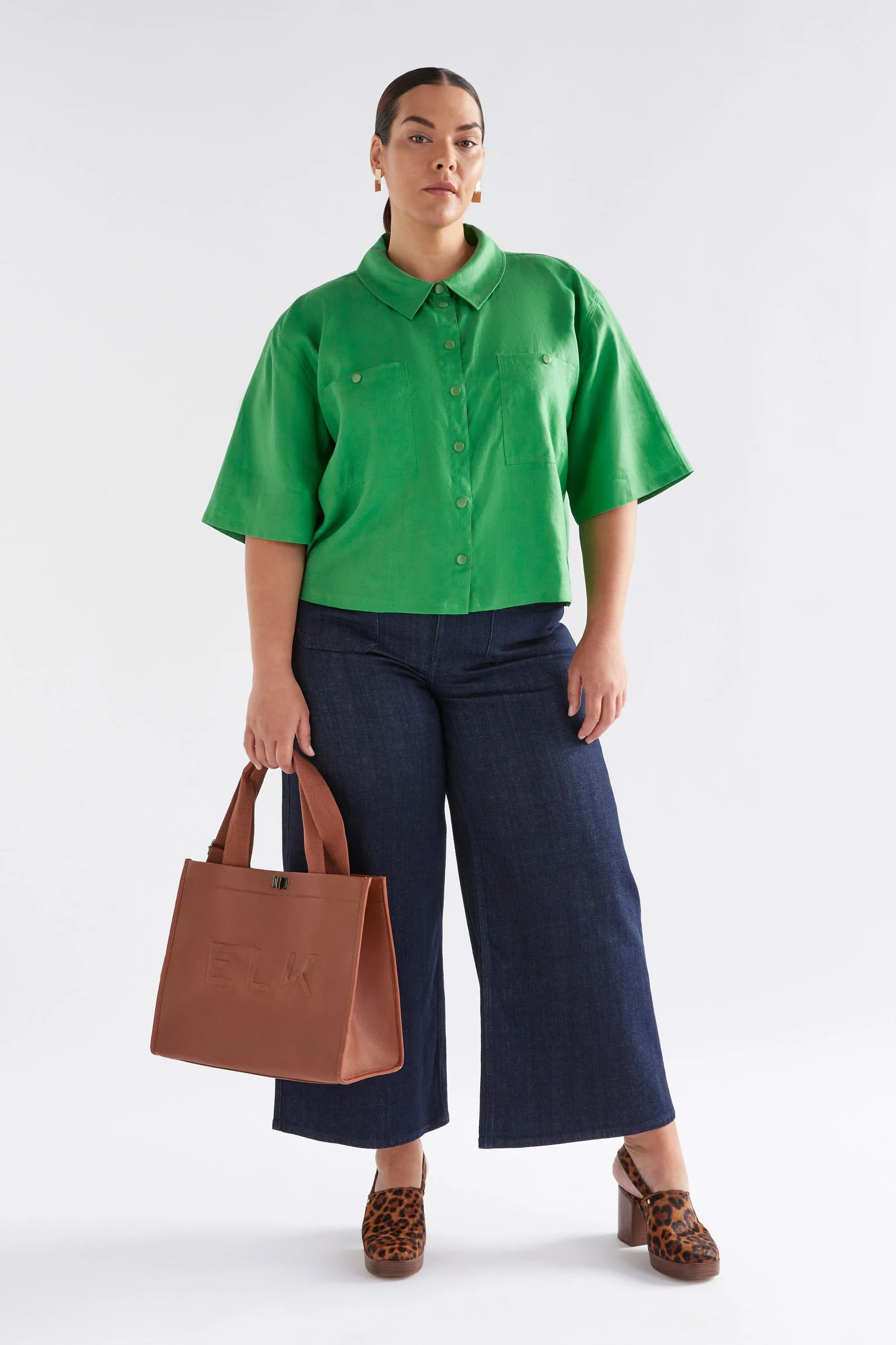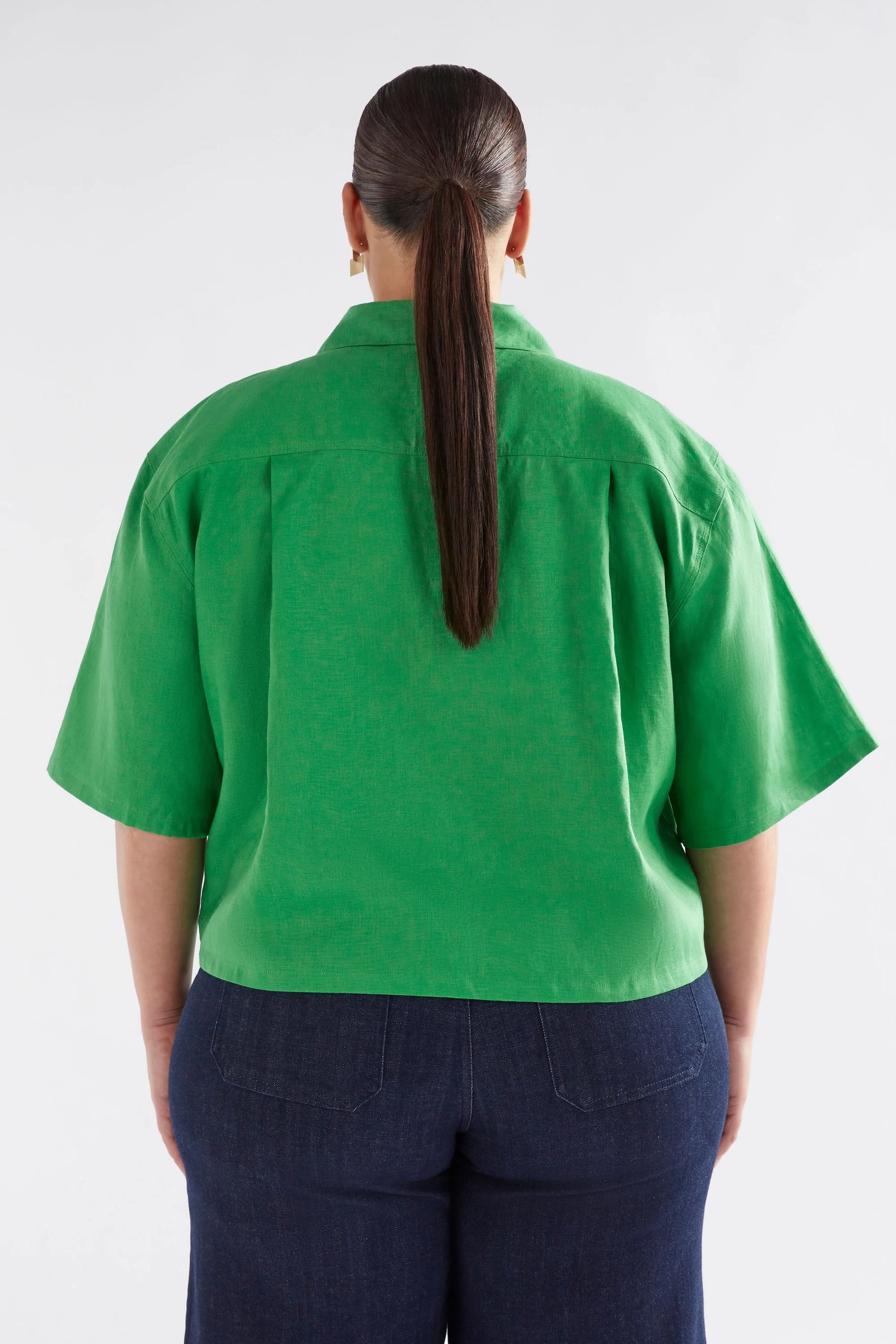 The Nayte Shirt is a button-through style with snap buttons, made from durable French linen. It features a structured statement collar and slightly dropped shoulders, creating a polished yet relaxed look. Bold front patch pockets elevate this classic wardrobe staple. Pair the Nayte Shirt in Vine Green with the Anneli Light Pant for a bold, coordinated look. Available in vibrant seasonal Vine Green and classic Black linen.