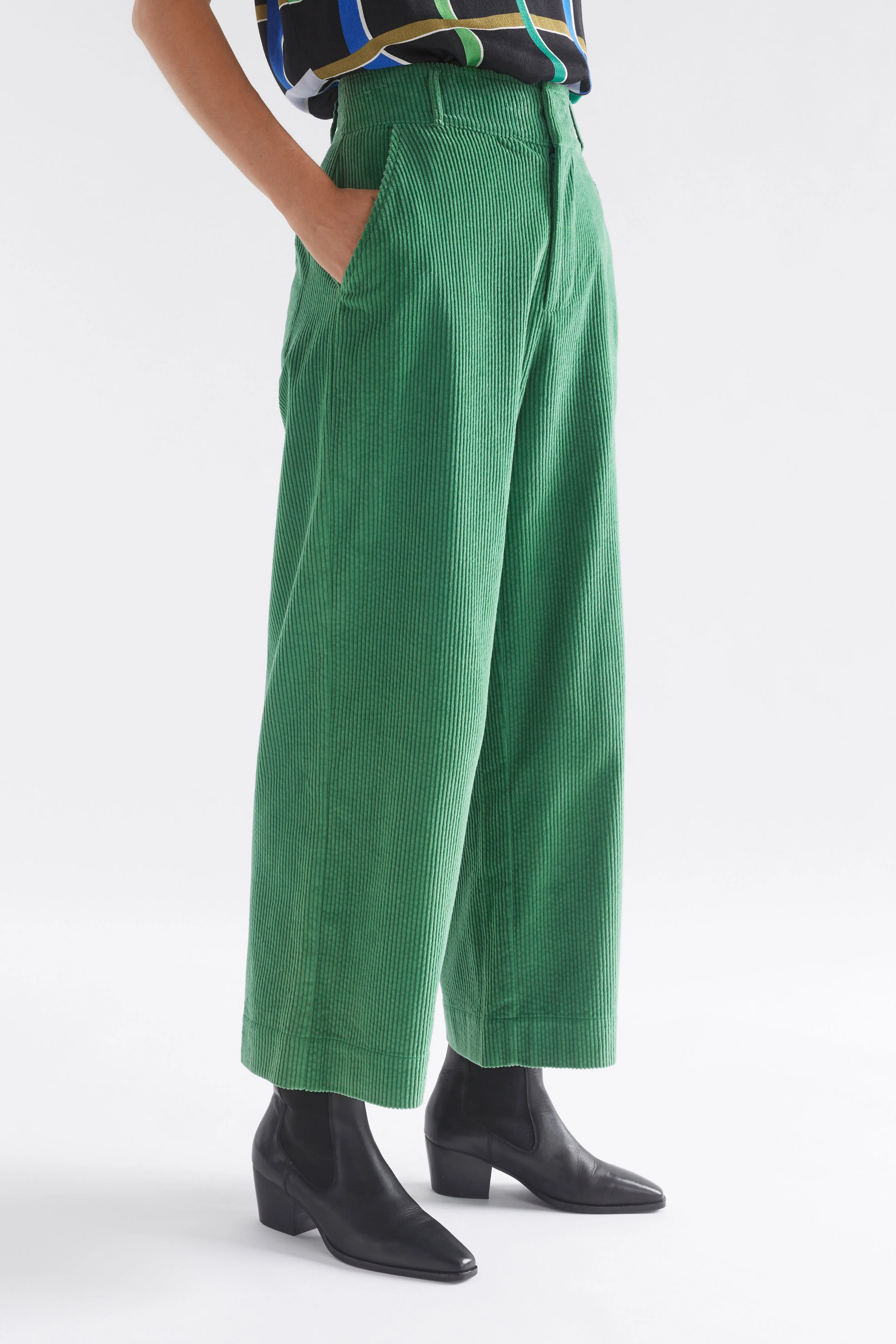 The Rhes Cord Pant is a wide-leg pant with a fixed waistband. The closure features a zipper fly, a double hook and bar closure and an internal Corozo button. The pant has angled front side pockets, back patch pockets and belt loops. This pant is designed to hit just below or at the ankle bone. Crafted from wide wale cotton cord, this is a heavyweight style that is soft and cosy.