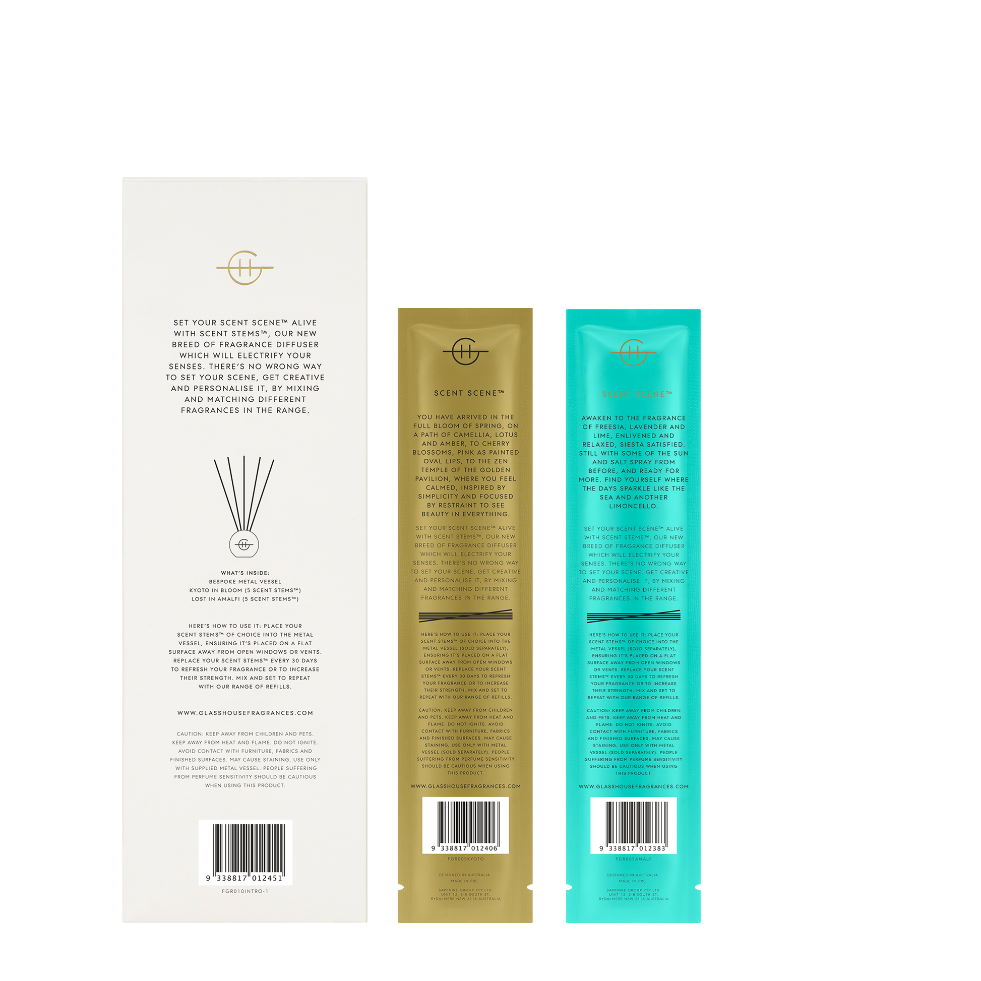 The Scent Scene™ Duo includes two individually packaged Scent Stems™ fragrances: Kyoto in Bloom Camellia & Lotus and Lost in Amalfi Sea Mist.