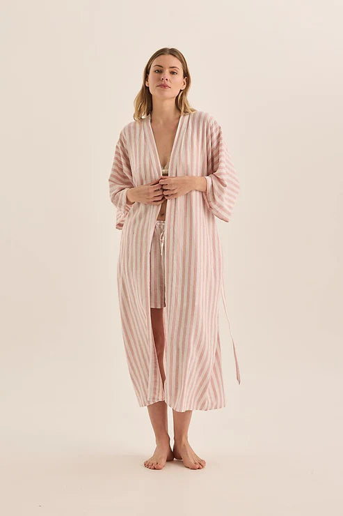 The Sunny robe in pink stripe by Gingerlilly. Indulge in supreme comfort with our maxi-length robe in a sophisticated white and natural stripe pattern. Crafted from a blend of linen and viscose, this robe combines the natural benefits of linen with enhanced durability and softness, minimizing wrinkles for effortless elegance. Featuring three-quarter sleeves and a waist tie, it exudes a relaxed yet stylish vibe. Perfect for luxurious lounging, this robe is an essential addition to your nightwear collection, offering both comfort and timeless appeal.