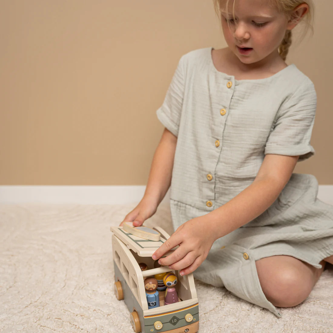 Let’s go on an adventure! Get into your camper and prepare for a lovely beach day or a trip with your family. Don’t forget to bring your suitcase, beach bag and surfboard! The roof of this vintage wooden camper can be removed, so the 4 wooden figurines easily fit inside. You can open the tailgate to store your luggage in the trunk of the camper. This complete play set stimulates imaginative playing.